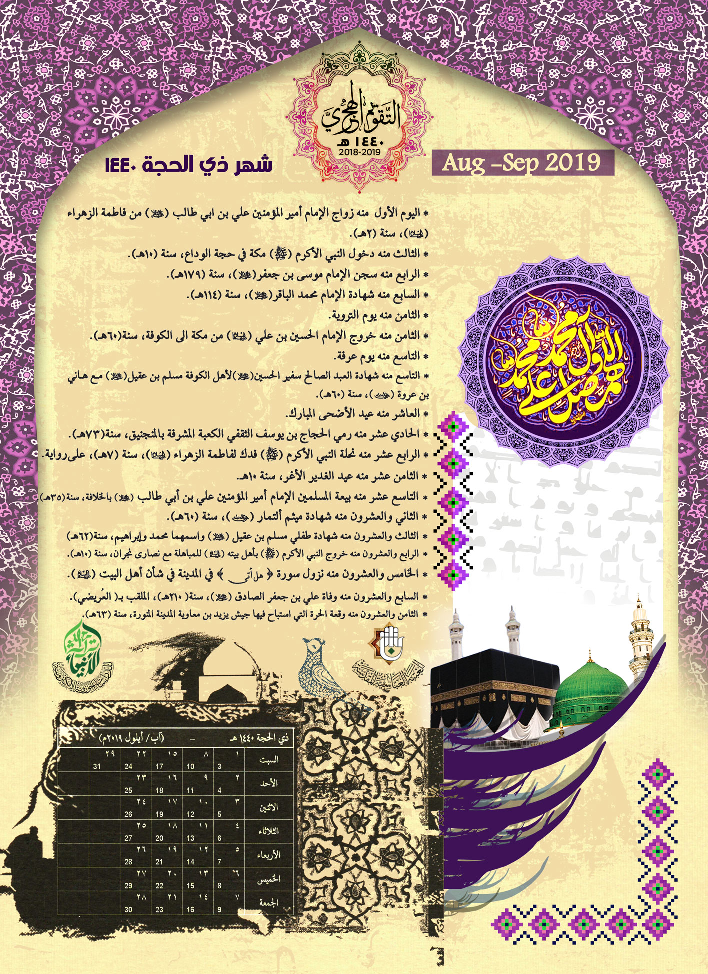 اهم الاحداث في شهر ذي الحجة الحرام لعام 1440 هـجري حسب مواقيت الأهلة لمكتب سماحة السيد السيستاني (دام ظله)