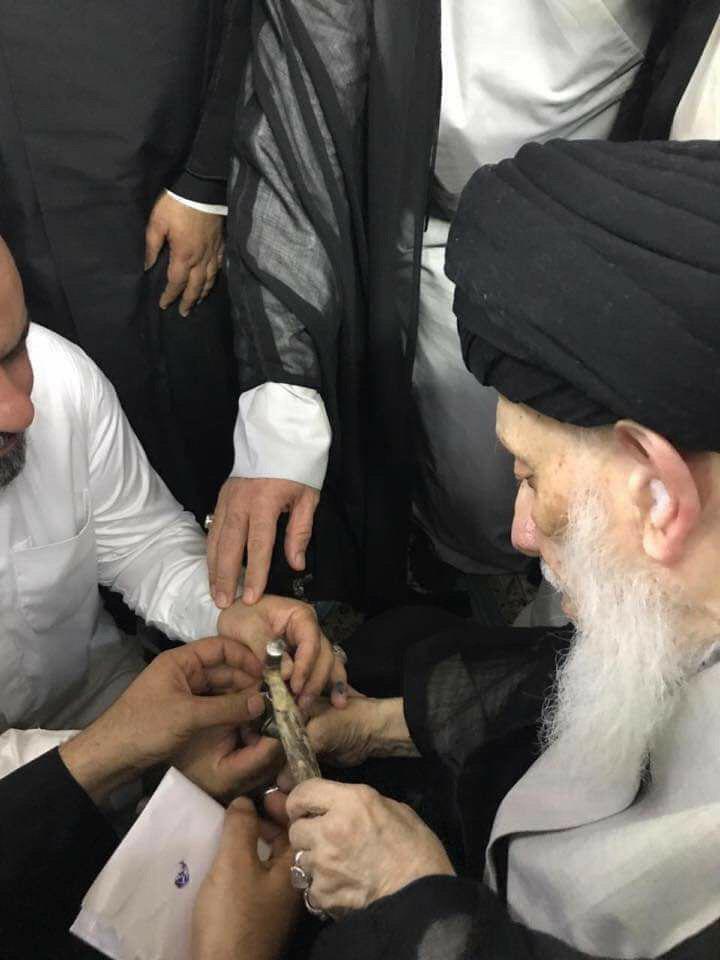 السيد صادق الخرسان هو شخصية حوزوية معروفة وهو نجل المرحوم السيد محمد رضا الخرسان الذي توفى في الأمس يقوم بتقديم ختم والده المرحوم إلى المرجع السيد محمد سعيد الحكيم ليعلن بذلك انتهاء وكالات واجازات والده وعلى محبي والده والمتاثرين به أن يذهبوا من الأن فصاعدا إلى المراجع الآخرين المتصدين لشؤون المرجعية