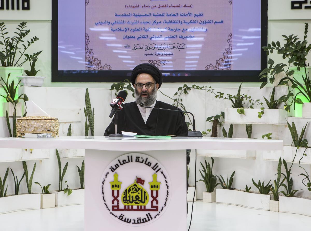 المؤتمرُ الذي يُقيمه مركزُ إحياء التراث الثقافيّ والدينيّ في العتبة الحسينيّة المقدّسة على قاعة خاتم الأنبياء(صلّى الله عليه وآله) بالتعاون مع جماعة كربلاء – كليّة العلوم الإسلاميّة بنسخته الثانية واستُهِلَّ بتلاوةٍ مباركة لآياتٍ من الذكر الحكيم ومن ثمّ قراءة سورة الفاتحة ترحّماً على أرواح الشهداء الأبرار، تلت ذلك كلمةٌ للمتولّي الشرعيّ للعتبة الحسينيّة المقدّسة سماحة الشيخ عبد المهدي الكربلائيّ (دام عزّه) ألقاها نيابةً عنه الشيخ علي الفتلاوي رئيسُ قسم الشؤون الفكريّة والثقافيّة في العتبة المقدّسة، وجاء فيها: "دأبت العتبةُ الحسينيّة المقدّسة على إقامة المهرجانات والمؤتمرات التي تُعنى بهذا المضمون، وهو إحياء ذكرى العلماء (رضوان الله تعالى عليهم)، لكون أنّ ذلك يُعدّ من الواجب الشرعيّ والاجتماعيّ ومن الواجب العرفيّ، وهذا الحضور حضورٌ بعين الله سبحانه وتعالى لأنّ الله تعالى هو من يرفع درجة العلماء، وهذا الرفع لدرجة العلماء على مدى التاريخ، ومن مصاديق درجة العلماء هذا الحضور الكريم لإحياء ذكراهم".