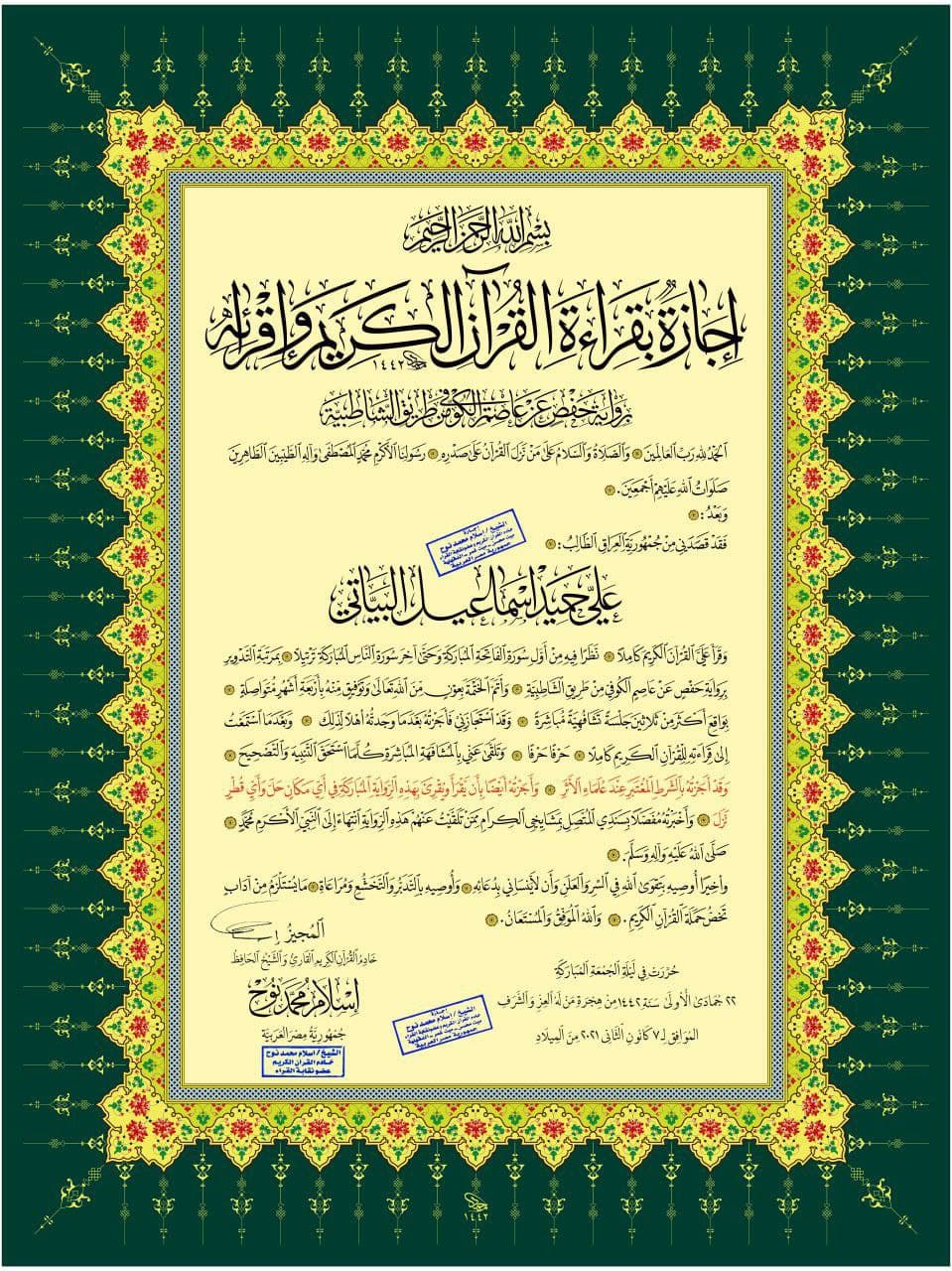 حصل"الأستاذ علي حميد البيّاتيّ" رئيس قسم الدّراسات القرآنيّة في جامعة أم البنين (ع) النسويّة الإلكترونية التابعة لقسم الشؤون الفكريّة في العتبة العباسية المقدسة على إجازة في القراءة و الاقراء للقرآن الكريم بروايةِ حفص عَنْ عاصم الكوفي من طريق الشاطبيّةِ من المجيز من جمهورية مصر العربية القارئ والحافظ الشيخ إسلام محمّد نوح بعدما عرض البيّاتيّ قراءته للمصحف كاملاً لمدة استغرقت أربعة أشهر متواصلة، وبطريقة الترتيل